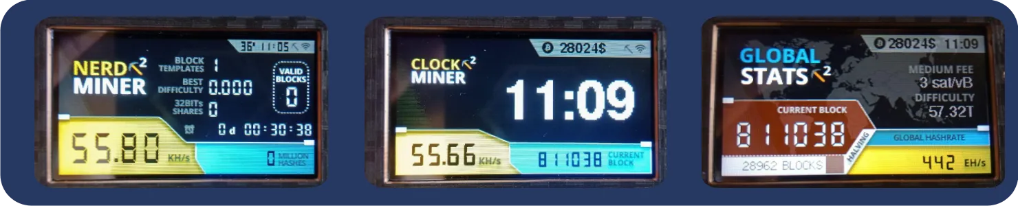 El software NerdMinerv2 tiene 3 pantallas diferentes, a las que puedes acceder haciendo clic en el botón en la parte superior derecha de la pantalla: