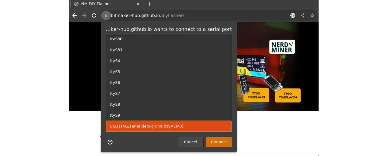 Una vez que se haya iniciado el webflasher, se abrirá una ventana emergente que muestra los diferentes puertos USB reconocidos por el navegador.