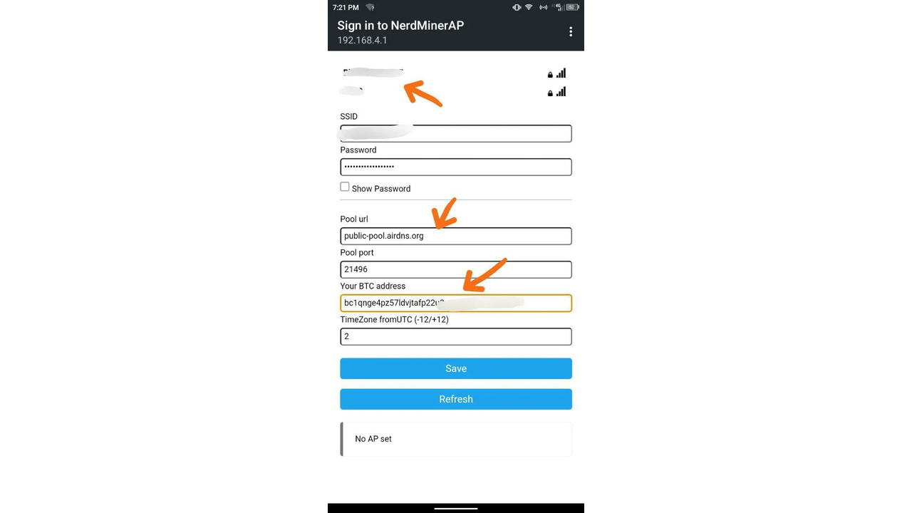 Activa el WiFi y conéctate a la red local NerdMinerAP. Si estás utilizando un teléfono inteligente, se abrirá automáticamente el portal de configuración; de lo contrario, ingresa la dirección 192.168.4.1 en un navegador.